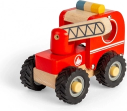 Houten brandweerwagen voor fantasierijk spel, ideaal voor de ontwikkeling van motoriek en oog-handcoördinatie. De combinatie van rode lak en natuurlijk hout spreekt elk kind aan.