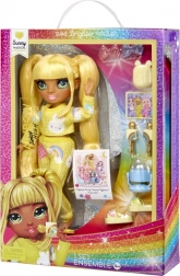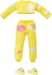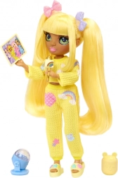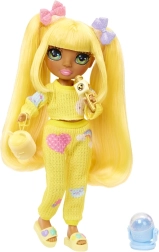Sunny is klaar voor een onvergetelijk pyjamafeest! Ze draagt een tweedelige gele pyjama met hartjes en een regenboog, bijpassende gele pantoffels en heeft lang steil haar in twee staarten met strikjes. Grote glanzende ogen en lange wimpers geven de pop een unieke uitstraling waar kinderen dol op zullen zijn.