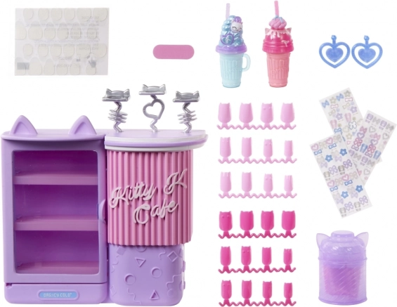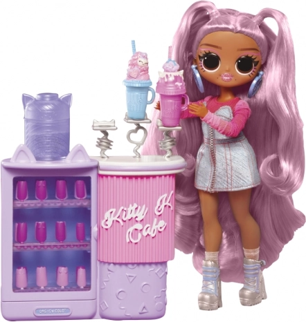 De L.O.L. Surprise O.M.G. Sweet Nails Kitty K Café set combineert mode, beauty en rollenspel. De pop met gearticuleerd lichaam en opvallend kapsel zorgt voor stijl, terwijl de thematische koffiebar met toog, taptuitjes en mini-koelkast uren speelplezier biedt. Inclusief accessoires voor gedecoreerde manicures – van vijl en stickers tot glitters en lak.