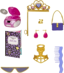 Cassie Cool valt op met haar glinsterende outfit en opvallende paarse lokken. De set bevat een bril, handtas, kroon en andere modieuze items voor eindeloze combinaties.