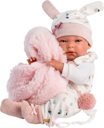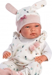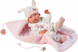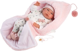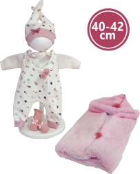 Stijlvolle 4-delige outfit voor de NEW BORN pop in maat 40–42 cm met een subtiel gestipt design en hoogwaardige handgemaakte afwerking uit Spanje. Onderdeel is een dubbelzijdig dekentje met capuchon en pompon, dat ook kan worden gebruikt als zacht matje, plus een mutsje en schoentjes. De praktische verpakking aan een hangertje maakt opbergen eenvoudig. Ideaal voor kinderen vanaf 3 jaar.