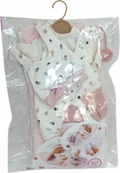Subtiele kleuren en stippen, met bijpassend mutsje en schoentjes, creëren een harmonieus outfit voor de NEW BORN pop in maat 40–42 cm.