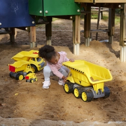 Zes grote wielen zorgen voor uitstekende stabiliteit op terrein en vloer. De niet-afgevende banden zijn zacht voor vloeren en het handvat maakt vloeiend en veilig kantelen van de lading mogelijk. Spelen met de kiepwagen ontwikkelt de grove motoriek, coördinatievaardigheden en stimuleert zelfstandigheid en ontdekkingsdrang.