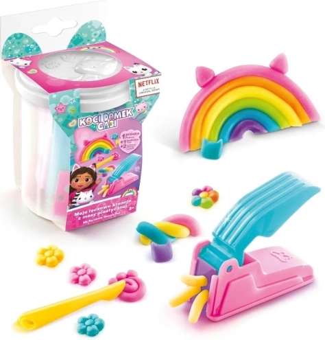 Ontdek de magische, creatieve wereld met de gelicentieerde set GABIN KATTENHUIS – Mijn regenboogcreaties. Een witte beker met gekleurde boetseerklei en accessoires stimuleert de fijne motoriek, creativiteit en concentratie van kinderen. De uitstekende afwerking en het sprookjesachtige design zullen alle kleine fans van de serie verrukken.