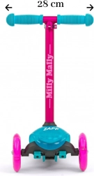 De kinderstep Zapp Milly Mally is ontworpen met het oog op de behoeften van kinderen. Dankzij het aluminium, uitneembare stuur is hij uitzonderlijk licht. Antisliphandvatten met beschermkappen beschermen de handen van de kleine reiziger, en het deck met speciale antislipcoating zorgt voor betere grip. Dankzij deze functies ontwikkelt het kind zich goed en snel, terwijl het veel plezier beleeft.