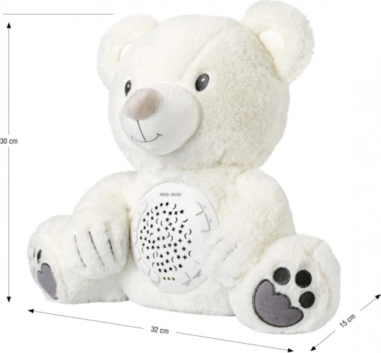 Pluchen speelgoed met projector Milly is de perfecte hulp voor ouders bij het kalmeren en in slaap brengen van baby's. Bij het starten van de projector wordt willekeurig gekozen uit 10 slaapliedjes terwijl de sterrenhemel wordt geprojecteerd.