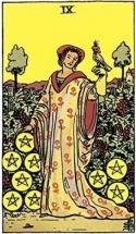 De kaart 'Nine of Pentacles' toont rijkdom en luxe, vaak een gewenst aspect tijdens een tarotlezing.