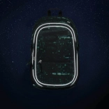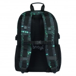 Deze rugzak valt op door een uniek ontwerp met een binaire codeprint in groen en zwart, dat de aandacht trekt van elke technisch georiënteerde student.