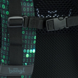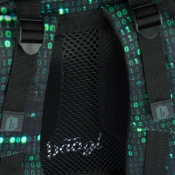 Deze rugzak valt op door een uniek ontwerp met een binaire codeprint in groen en zwart, dat de aandacht trekt van elke technisch georiënteerde student.
