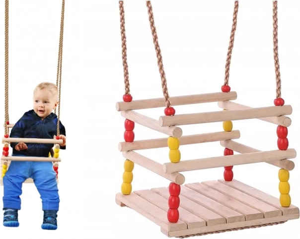 Sterke gevlochten touwen met ringen en beslag zorgen voor stabiliteit en veiligheid. De compacte afmetingen besparen ruimte en de schommel is gemakkelijk te verplaatsen of op te bergen. Gekleurde kralen geven een speelse uitstraling en kinderen zullen de schommel snel geweldig vinden.