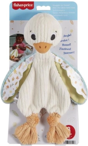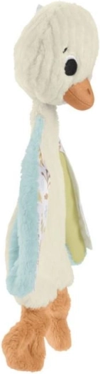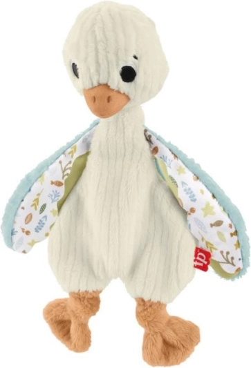 Schattige en zachte sensorische gans van Fisher-Price die je baby thuis en onderweg kalmeert. Heeft verschillende texturen op de vleugeltjes om te ontdekken met de tast en rinkelt bij het schudden, wat het gehoor zachtjes stimuleert. Ultralicht, knuffelbaar en machinewasbaar – de ideale eerste knuffelvriend in de armen.