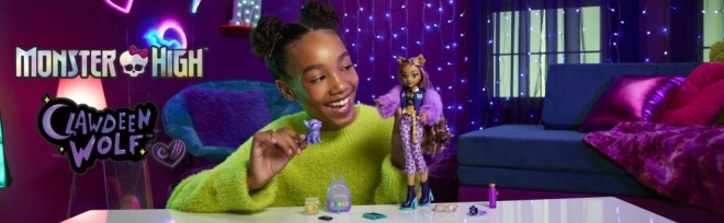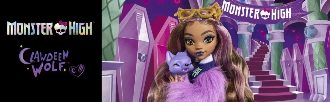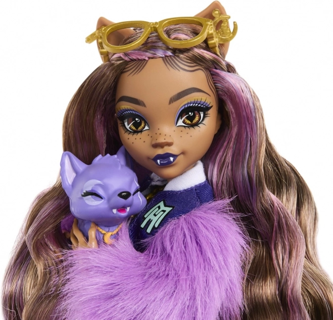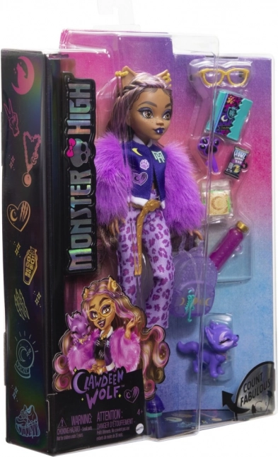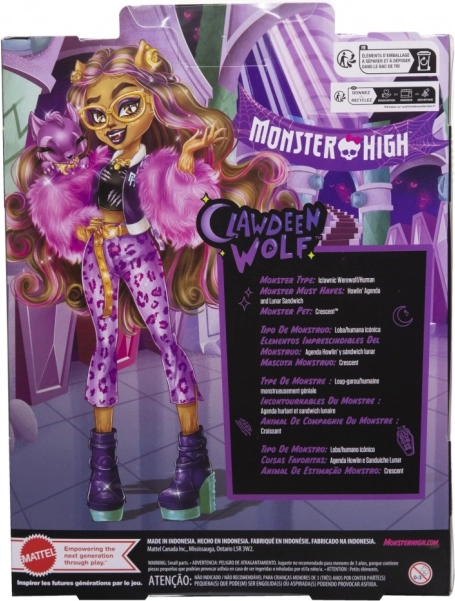 Stijlvolle pop Monster High Clawdeen Wolf in een iconische paarse outfit brengt modieuze fun, bewegende gewrichten en volop accessoires voor creatief spel. Inclusief schattig huisdiertje Crescent, bril, rugzak en snacks – ideaal cadeau voor kinderen vanaf 4 jaar.
