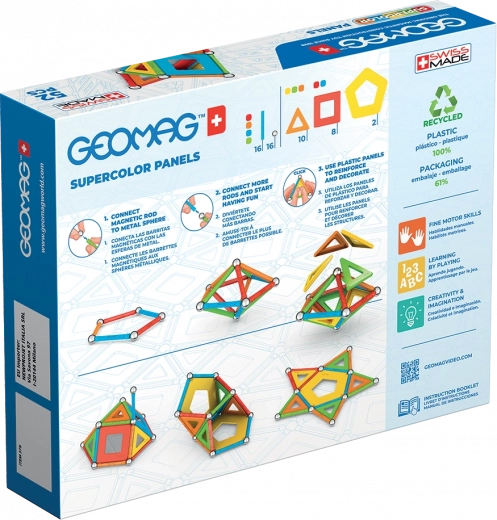 Met de staafjes en bolletjes van Geomag maak je eenvoudig originele en stabiele 3D-constructies. Driehoekige, vierkante en vijfhoekige panelen verstevigen en versieren de modellen, terwijl de felle kleuren de verbeelding stimuleren. Onderdelen zijn gemaakt van 100% gerecycled plastic – duurzaam én milieuvriendelijk.