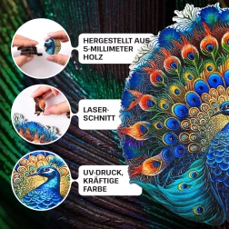 Geniet van de unieke ervaring van de houten puzzel met een pauwmotief! Elk van de 200 stukjes is nauwkeurig met laser gesneden, wat zorgt voor perfecte precisie en gladheid. Dankzij de moderne technologie van UV digitale druk brengt de puzzel realistische en levendige kleuren in elk stuk.