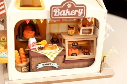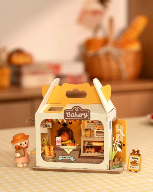 Verzorgde vitrines, bordjes en een rijke uitrusting zorgen voor een realistische uitstraling van de bakkerij, die prachtig staat op een plank of bureau.