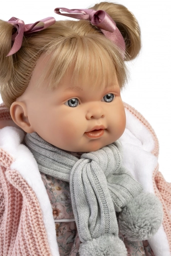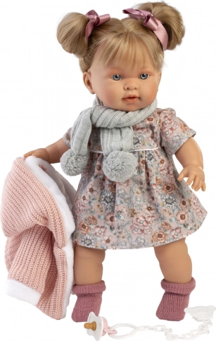 De pop draagt een bijpassende outfit met jasje, sjaaltje en een speen aan een clip. Originele Llorens-kleding voor maat 42 cm is apart verkrijgbaar.