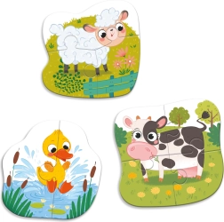 Deze set bevat drie afzonderlijke contourpuzzels met boerderijdieren, elk met een verschillend aantal stukjes (2, 3 en 4). Dankzij de oplopende moeilijkheidsgraad is de set ideaal voor de eerste puzzelervaringen, bevordert concentratie en geeft kinderen plezier en een gevoel van succes.