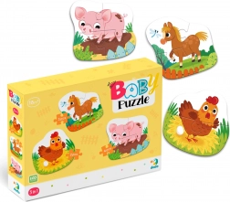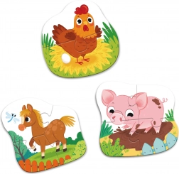 Deze set babypuzzels is een ideale keuze voor de eerste kennismaking van kinderen met puzzels. Drie afzonderlijke contourafbeeldingen van boerderijdieren hebben verschillende aantallen stukjes (2, 3 en 4), zodat het kind stap voor stap beter wordt en bij elke voltooide afbeelding plezier beleeft aan het succes.