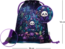 Ontdek een praktische en trendy rugzakzak met panda- en bloemenmotief. Dankzij het duurzame, afwasbare materiaal is hij ideaal voor schoenen, sportuitrusting en kleine spulletjes voor school of clubs. Het kleurrijke design in tinten paars, blauw en groen valt direct op.