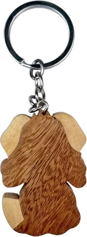 De sleutelhanger is vervaardigd uit vijf soorten natuurlijk hout, waaronder geel broodvruchthout, lichtbruin tamarindehout en andere, die zorgen voor natuurlijke kleurtonen.