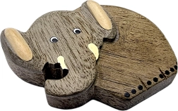 Deze stijlvolle olifantenmagneet is met de hand vervaardigd uit een combinatie van verschillende exotische houtsoorten, waarvan de natuurlijke tinten een unieke mozaïeklook creëren. Het hout is niet geverfd – slechts subtiel bijgewerkt om details te accentueren, zodat je kunt genieten van de authentieke natuurlijke textuur en kleur.