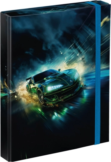 Praktische map voor schriftjes in A5-formaat met een raceauto-motief beschermt schoolspullen tegen beschadiging. Biedt een harde kartonnen kaft, een glanzend en duurzaam oppervlak en een binnenvak met klep en elastiek tegen uitvallen.