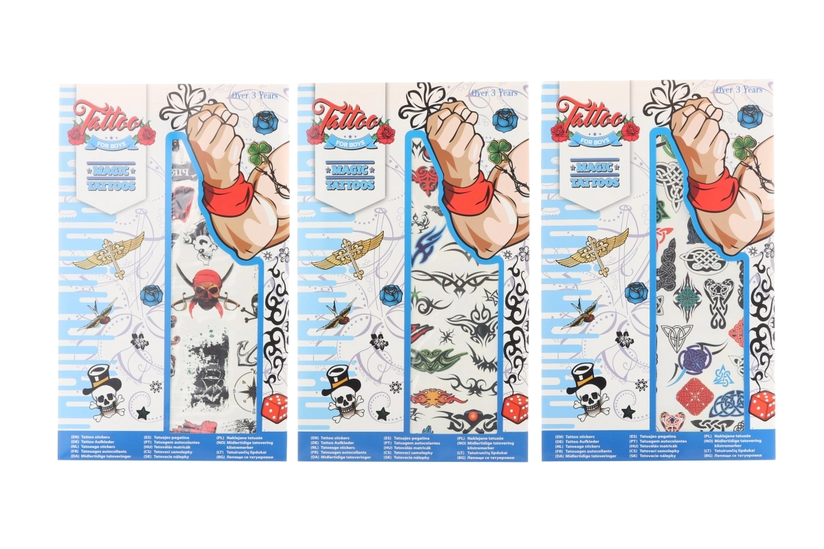 De set tijdelijke tatoeages voor jongens biedt een kleurrijke selectie motieven die kleine avonturiers zullen aanspreken. De tatoeages worden eenvoudig met water op de huid overgebracht en vervagen na enkele dagen vanzelf. Geweldig als kleine cadeautjes, beloningen of als aanvulling op kostuums.