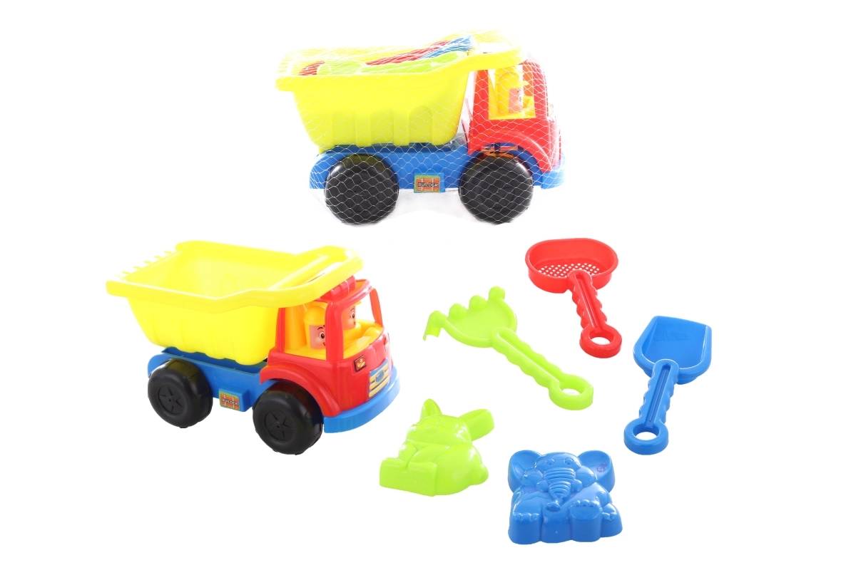 De zandset bevat een auto, een schepje, een zeef, een harkje en 25 zandvormpjes. Verpakt in een net. Afmeting ca. 23 x 14 x 13 cm. Leeftijd 3+