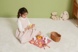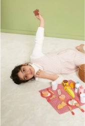 De VIGA picknickset voor kinderen biedt alles wat kleine koks nodig hebben voor de perfecte picknick. De stevige mand van “gevlochten” riet is licht om te dragen en binnenin vind je servies, bestek, drankjes en een kleurrijke selectie houten lekkernijen. Een deel van het eten is opdeelbaar in stukken en verbonden met klittenband, zodat kinderen veilig kunnen snijden en serveren.