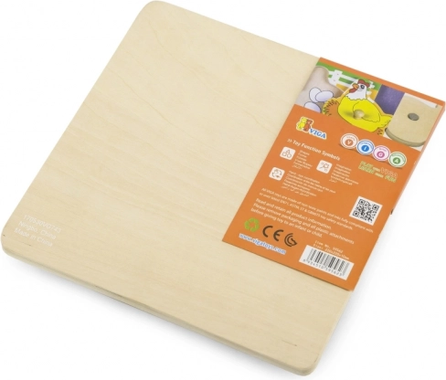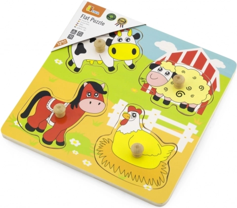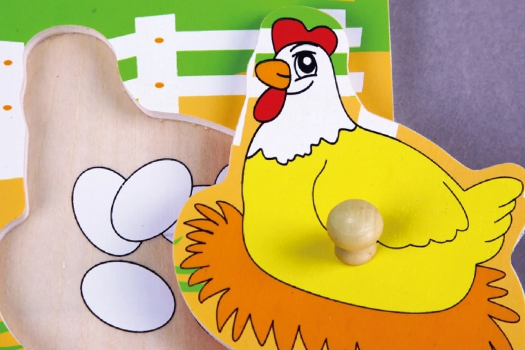 De duurzame houten plaat van circa 22 × 22 cm is rijk geïllustreerd met een boerderijmotief dat kinderen motiveert tot verder spelen en het uitbreiden van hun woordenschat (bijv. koe, schaap, paard, kip). De puzzel is geschikt vanaf 12 maanden en is dankzij het compacte formaat makkelijk op te bergen en mee te nemen.