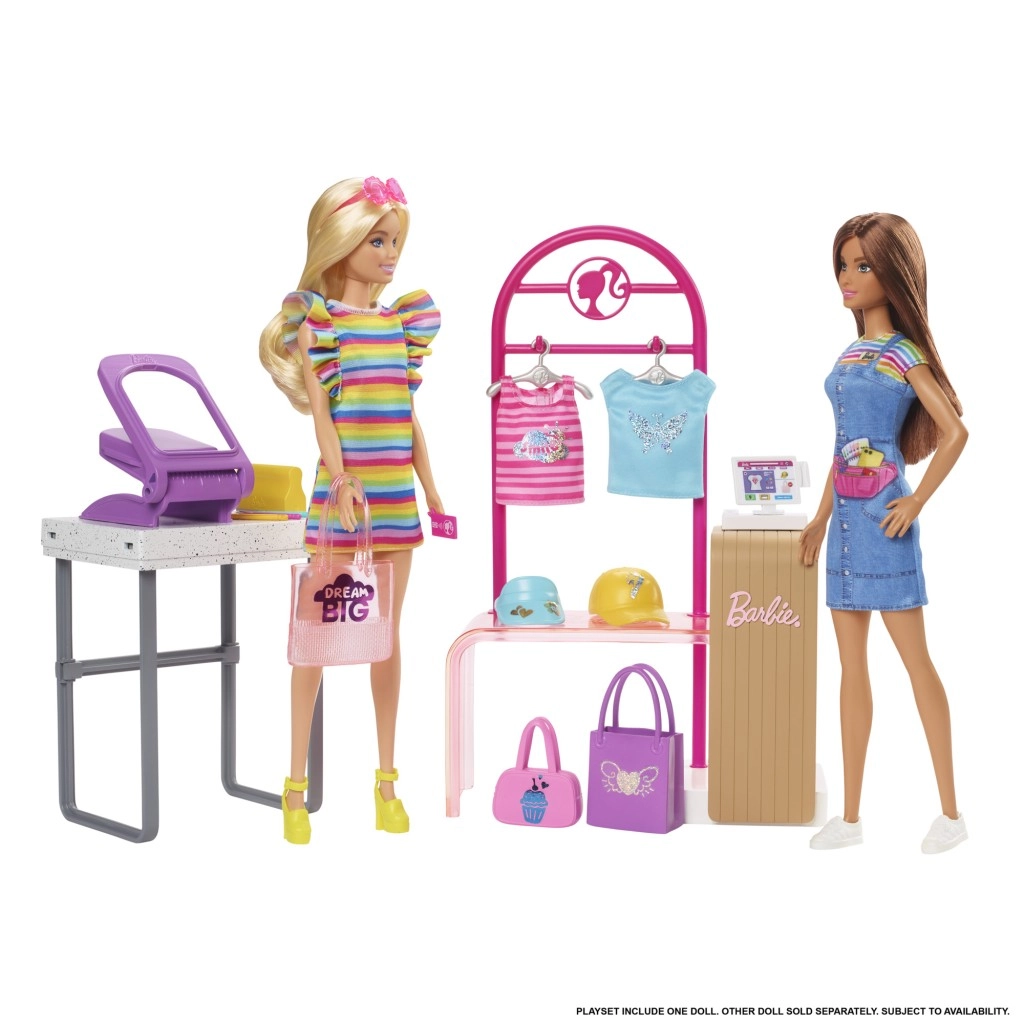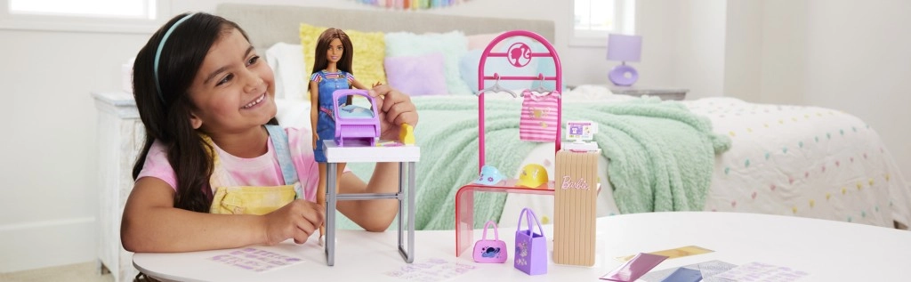 De Barbie Modestudio-speelset met pop laat kinderen hun eigen boetiek met outfits openen en biedt drie speelwijzen: ontwerpen, maken en verkopen. Kleine modeontwerpers kunnen unieke outfits creëren met de zeefdrukfunctie op folie en ze versieren met herbruikbare stickers voor meer dan 150 verschillende looks. De kledingstandaard met hangers is ideaal om de gemaakte outfits op te hangen, te presenteren en in te pakken voor de verkoop. De pop kan niet zelfstandig staan. Leeftijd 5+