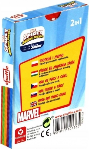 Een set van 25 kaarten met personages uit de tv-series Spidey en zijn Supervrienden, waarmee je twee kaartspellen kunt spelen: Zwarte Piet en Memo, die het logisch denken van de jongste kinderen verbeteren. Het doel van het spel is om zoveel mogelijk paren te vinden.