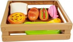 brood, toast, hotdog, vis, cakeje/cupcake, snijplankje, mes, kunststof krat