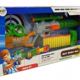 .Het kinderspeelgoedpistool met schuimammunitie is gemaakt van toegestaan materiaal, namelijk kunststof. De constructie lijkt op een echt pistool, maar is zeer veilig – geen scherpe randen of onderdelen. De bediening van het speelgoed is heel eenvoudig, maar zorgt voor veel plezier.
