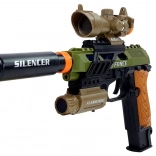 Militaire kinderset voor kleine actiefans: bevat een pistool met licht- en geluidseffecten, een rubberen mes met schede en een medaille. Gemaakt van hoogwaardige kunststof, in legergroen, ideaal voor creatief spel en als accessoire voor een kostuum. Het pistool biedt schietgeluiden, lichteffecten, een geluiddemper, een vizier en een zaklamp. Geschikt vanaf 3 jaar, batterijen inbegrepen.