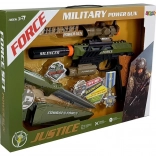 Maak van elke dag een avontuur met deze complete militaire set die fantasie, rollenspel en de ontwikkeling van de motoriek stimuleert. Het realistische pistool met schot-, herlaad- en hulsvalgeluiden, aangepast geluid met gemonteerde demper en opvallende verlichting zorgt voor spanning en plezier.
