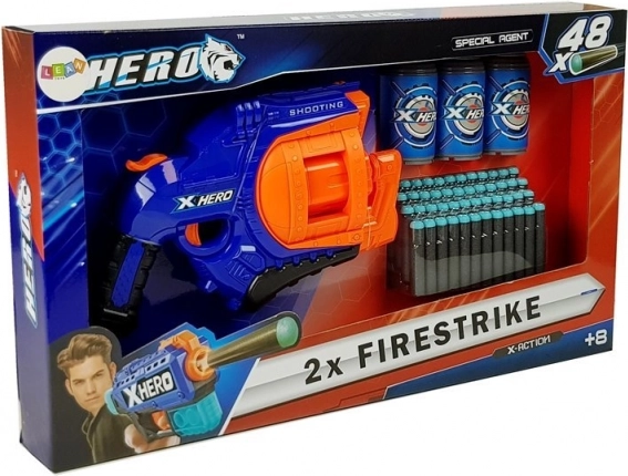 Het pistool heeft een draaiend magazijn voor 6 kogels. Om een kogel af te vuren trek je de spanhendel omlaag en druk je op de trekker! Het grote aantal kogels maakt eindeloos speelplezier mogelijk. De set bevat ook blikjes als doelen!