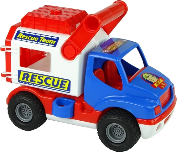 Het voertuig is uitgerust met rubberen wielen met antislipprofiel voor een soepele rit, heeft openende rode achterdeuren en een bovencompartiment voor kleinigheden. Een zijdelingse veiligheidspal houdt de opbouw stabiel – na ontgrendeling wordt de opbouw mobiel en kan met een hendel naar achteren worden gekanteld. Stickers met het thema “Rescue/Rescue Team” ondersteunen thematisch spel.