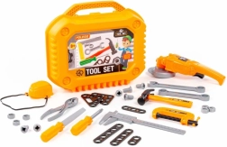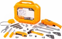 De kindergereedschapsset is ontworpen voor kleine klussers die mama of papa willen nadoen in de werkplaats of in de tuin. Alle onderdelen zijn van duurzaam kunststof, veilig om mee te spelen en eenvoudig op te bergen in de stevige koffer. De slijper laat de schijf draaien wanneer je op de knop drukt, het beschermingsmasker heeft een elastische band en past daardoor iedereen.