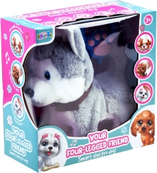 Een schattige interactieve pluchen huskyhond zal elk kind blij maken. Na het aansluiten van de pootvormige lus begint hij bij een druk op de knop te lopen, met zijn staart te kwispelen en met zijn kop te bewegen. Hij reageert op aaien met blafjes en speelt vrolijke muziek af, wat empathie, verantwoordelijkheid en de ontwikkeling van de fijne motoriek stimuleert.