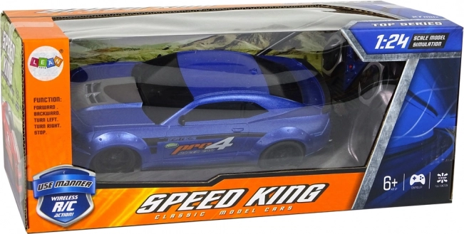 De blauwe RC-auto op schaal 1:24 biedt een realistische look en vlotte rit voor jonge en oudere liefhebbers. Dankzij de lichte en duurzame constructie is hij ideaal voor thuisraces en het trainen van fijne motoriek en coördinatie.