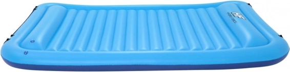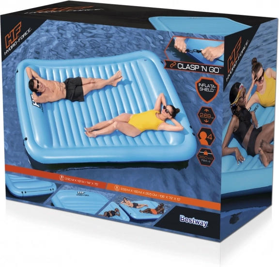 Het grote opblaasbare drijfeiland Hydro-Force Sun Soaker van Bestway is ontworpen voor wie graag met een grotere groep vakantie viert. Dankzij de indrukwekkende afmetingen biedt het gemakkelijk plaats aan vier volwassenen, en met het ingebouwde kussen rondom kan iedereen comfortabel zonnebaden. De ingebouwde Clasp 'N Go-sluitingen maken het mogelijk meerdere drijfeilanden aan elkaar te koppelen, voor nog meer plezier met vrienden in een grotere groep! Het Inflata-Shield-materiaal zorgt voor weerstand tegen lekken en beperkt uitrekken.
