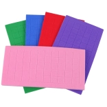 De set bevat gekleurde foam vierkantjes in vijf verschillende kleuren: roze, paars, blauw, rood en groen.