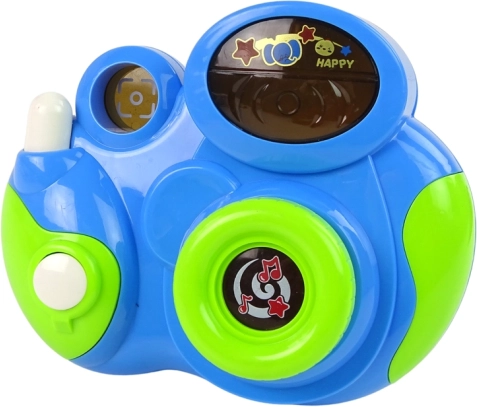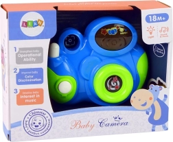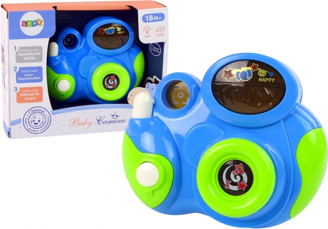 Interactieve kindercamera in het blauw met , melodieën en een realistisch sluitergeluid. Stimuleert oog-handcoördinatie en zintuiglijke ontwikkeling, ideaal voor kinderen vanaf 18 maanden.