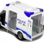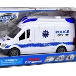 De politiewagen met sirene en blauwe zwaailichten is een keuze voor elke jonge bestuurder van de geüniformeerde dienst. De auto is volledig van kunststof, in kleuren die passen bij politievoertuigen. Het voertuig heeft een frictiemechanisme op de voorwielen waardoor het zelfstandig rijdt. Geluid- en lichteffecten worden geactiveerd met knoppen op het dak.