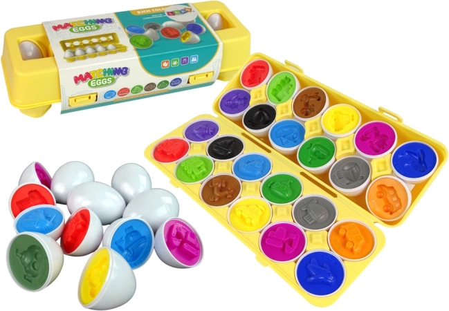 Leuke educatieve spel voor kinderen: set van 12 eitjes met voertuigmotief die je kunt combineren en sorteren op vorm en kleur. Stimuleert fijne motoriek, oog-handcoördinatie en logisch denken. Gemaakt van veilige, duurzame materialen, in een praktische afsluitbare doos in de vorm van een eierdoos.