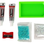 Inhoud van de set: rendierhanger (hoogte ca. 7 cm), 2 verpakkingen gekleurde kristallen, bakje voor kristallen, 2× lijm in tube, wasstokje en slijpertje.