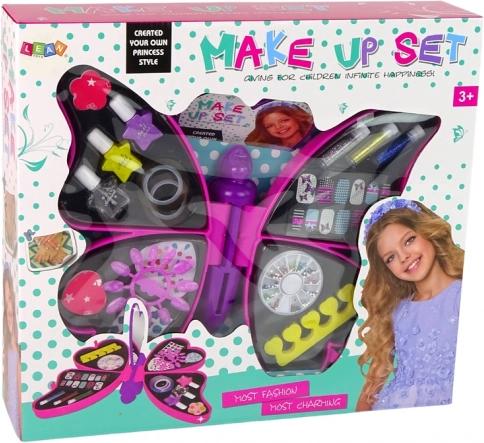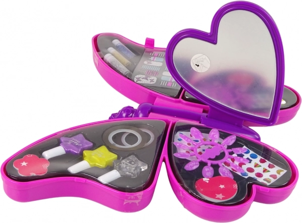 Het hart van de set is een uitklapbare etui in de vorm van een vlinder. Binnenin vind je overzichtelijke vakken voor lakken, glitters, steentjes en accessoires, plus een spiegeltje voor gemakkelijk make-up en versieren.