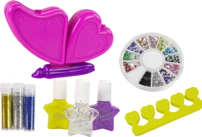 Combineer drie kleuren nagellak met losse glitters, stickers en steentjes. De vingerspreider en de hartvormige vijl helpen bij precies en comfortabel versieren.