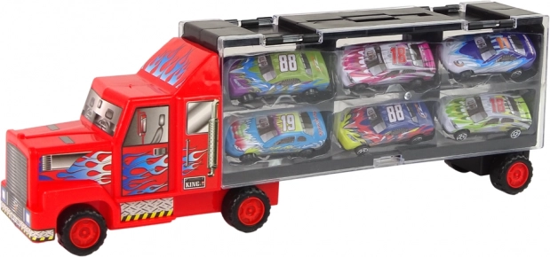 De vrachtwagen is uitgerust met doorzichtige vakken voor het transport van raceauto's. Eenvoudig mee te nemen dankzij het handvat bovenop.